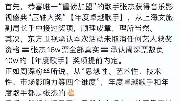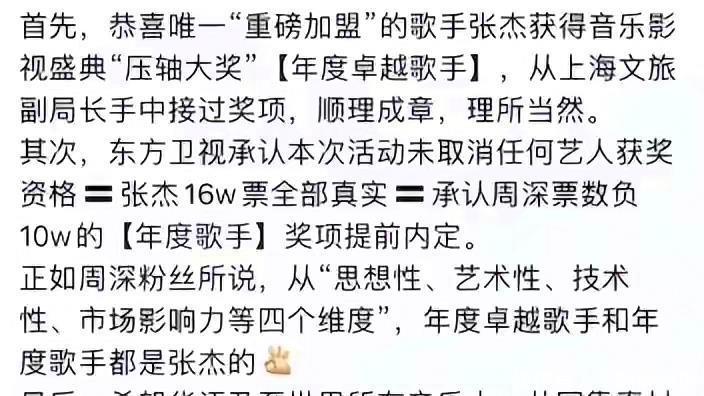 这事还得从2024年说起,当时张杰和周深一起参加了一个音乐评选活动,粉丝们为了给张杰冲票,卯足了劲拉票打卡,最后张杰的票数比周深高出不少。本以为大奖稳了,结果最后最大的奖项颁给了周深,张杰只拿到了一个不起眼的小奖。